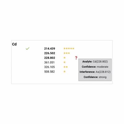 • Software intelligente IntelliQuant, fornisce conoscenze di livello esperto per identificare le interferenze spettrali che possono influire sulla precisione, fornendo raccomandazioni che consentono di selezionare rapidamente la lunghezza d'onda migliore ed evitando inutili rimisurazioni