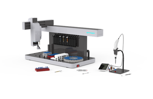 - sostituzione robotica versatile della siringa: il volume della siringa può essere modificato durante un flusso di lavoro per ridurre l'errore di erogazione e migliorare l'efficienza complessiva
