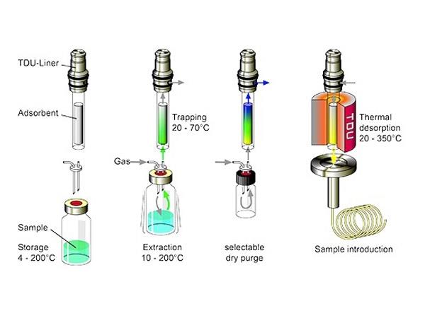 - Gli analiti provenienti dallo spazio gassoso sopra un campione liquido, viscoso o solido vengono continuamente arricchiti su un adsorbente
