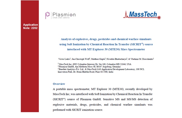 In questa nota applicativa è illustarto l'interfacciamento della sorgente Soft Chemical Reaction In Transfer (SICRIT®) di Plasmion con lo spettrometro di massa MTE30 di MassTech, per l'analisi di materiali esplosivi, farmaci, pesticidi e simulanti di agenti chimici bellici.