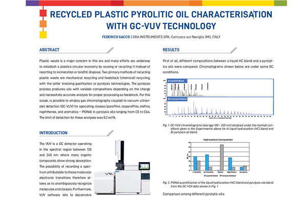Questo studio evidenzia che la GC-VUV (gascromatografia accoppiata alla rivelazione ultravioletta sotto vuoto) è in grado di caratterizzare gli oli pirolitici nei loro principali gruppi costituenti.